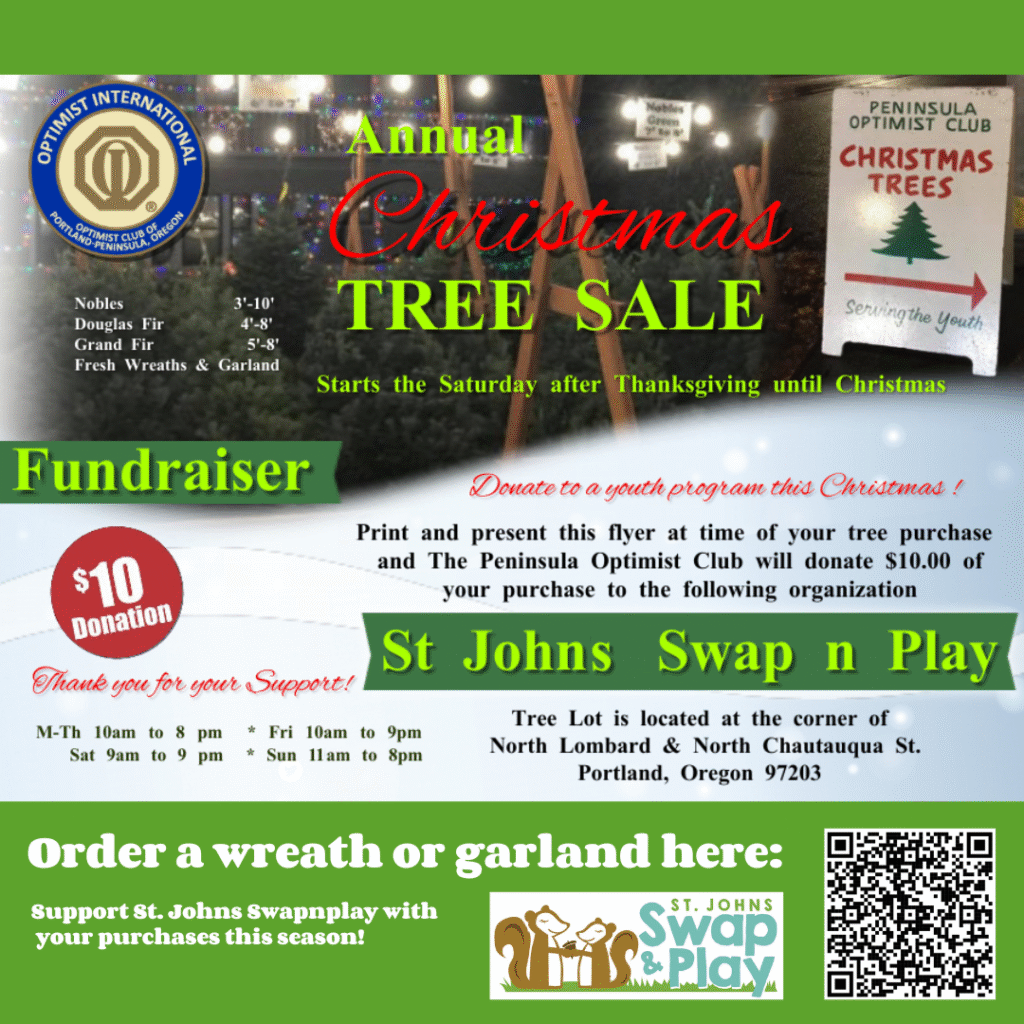 Deck your halls with beautiful winter wreaths and trees this holiday season, and support St. Johns Swapnplay at the same time! We’re partnering with Peninsula Optimist Club for our annual fundraiser, and they’re offering two easy ways to support Swapnplay!